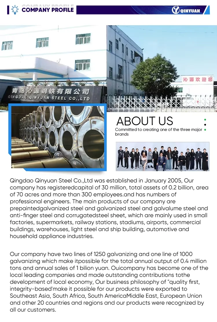 Qingdao Qinyuan Steel Co., Ltd. is a leading steel manufacturer established in 2005 with 300 employees and 70 acres of facility. It produces 0.4 million tons annually, exporting to 20 countries. The company specializes in galvanized steel, galvalume steel, and corrugated sheets, with certifications for quality and safety.